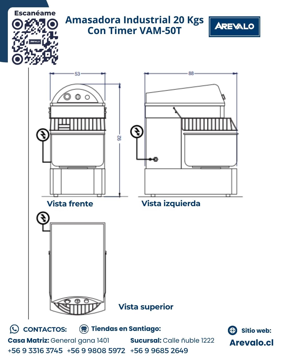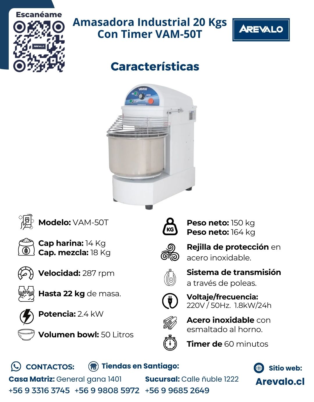 El equipo incorpora un timer integrado, que permite controlar el tiempo de amasado para lograr resultados consistentes en cada lote. Su estructura robusta está diseñada para soportar uso continuo en ambientes profesionales, proporcionando estabilidad, potencia y durabilidad.