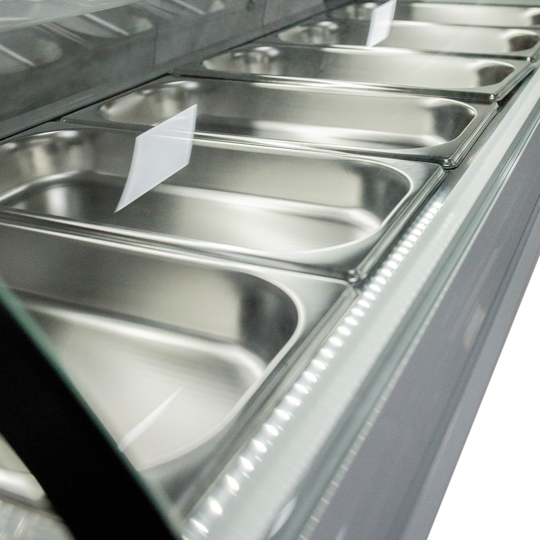 - Iluminación LED interna: Luz superior LED que resalta la presentación de los alimentos, ofreciendo una visualización clara y atractiva para los clientes.